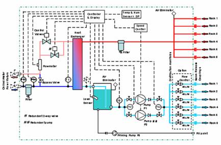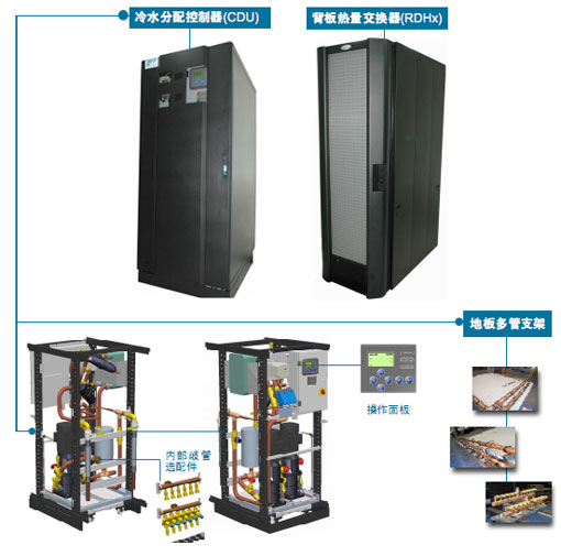 - 海瑞斯水冷系统,主要由CDU——冷水分配控制器、RDHx——背板热量交换器以及CDU至RDHx的管路组成,CDU的冷水源由机房公共冷水供应系统提供(冷水机组)。为IT设备机柜专门设计的CDU作为整个系统的核心,对背板热量交换器(RDHx)起分配、调节、监控和报警的作用。整个系统实现了设计安全、运行安全及使用安全。