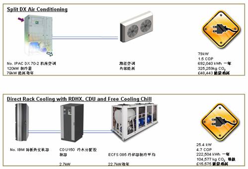 - RDHx采用无风机设计,设备不需要N+1的配置,而且不需要停止服务器就可以很容易地安装在新的或者正在使用的机柜上。对于普通服务器机柜和刀片式机柜,RDHx可以从每个机柜上带走最高20KW的热量。